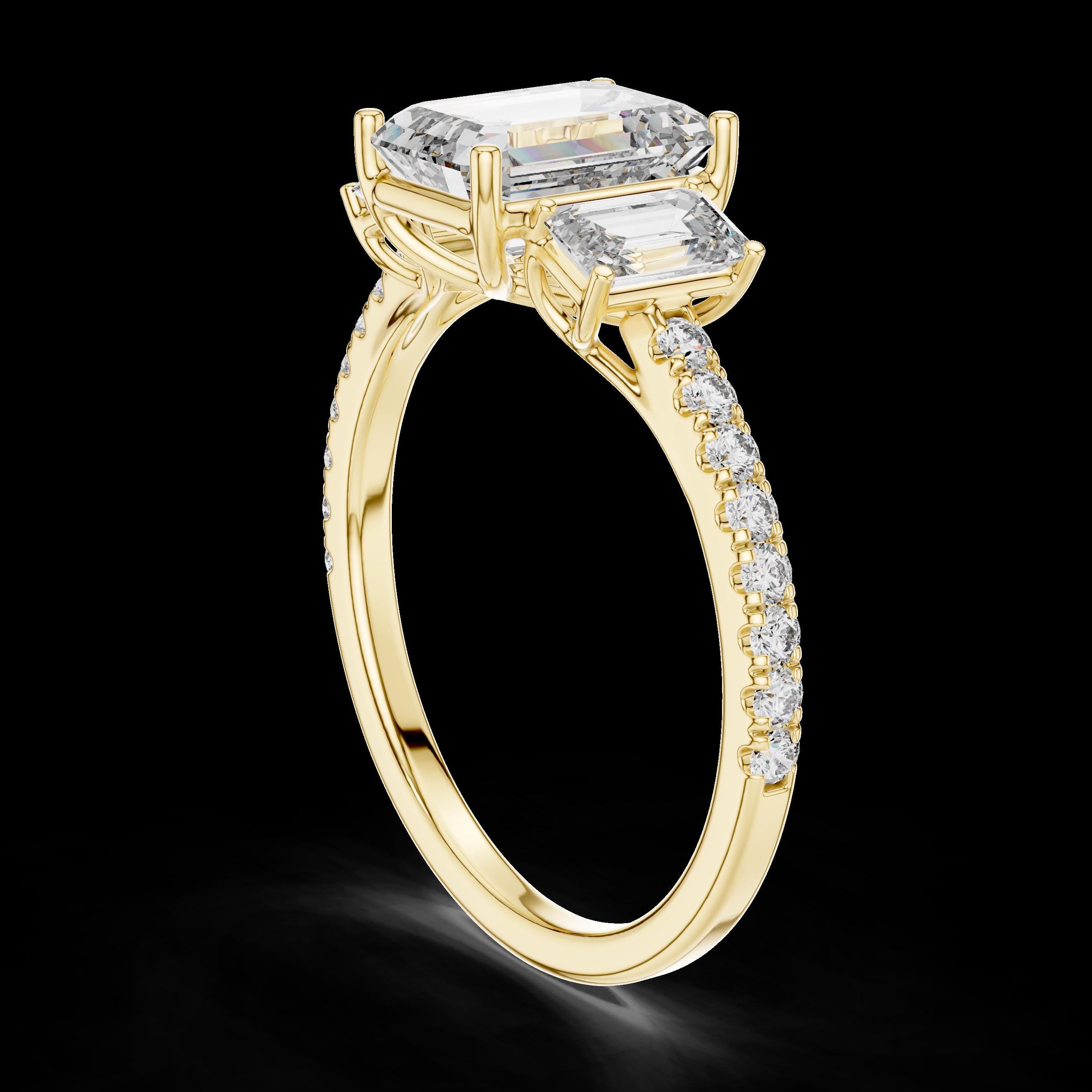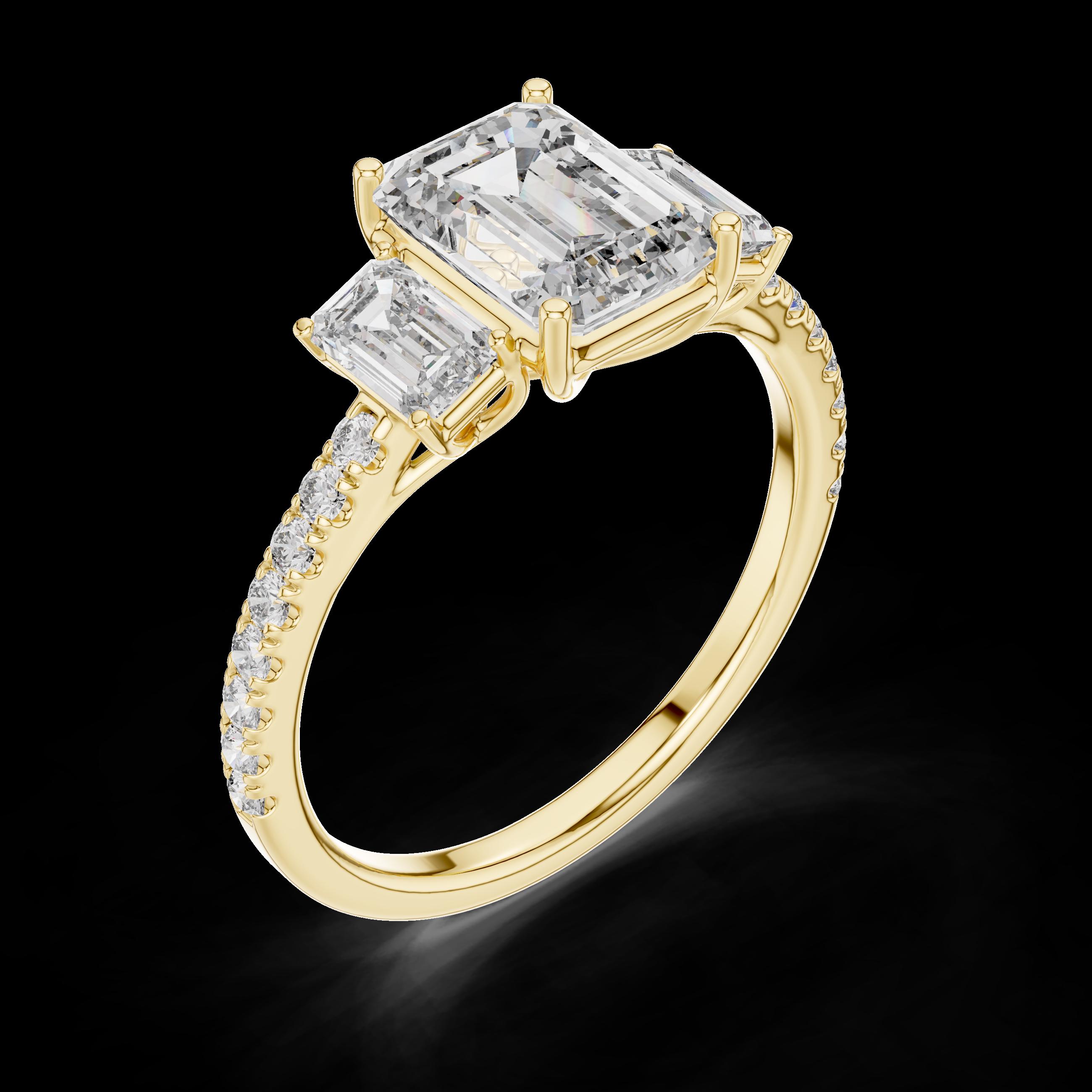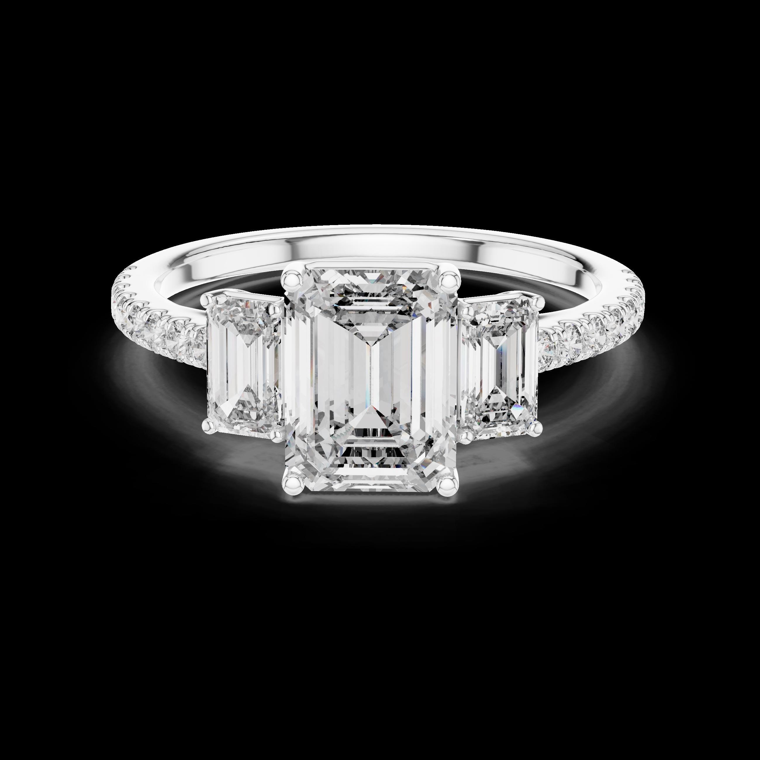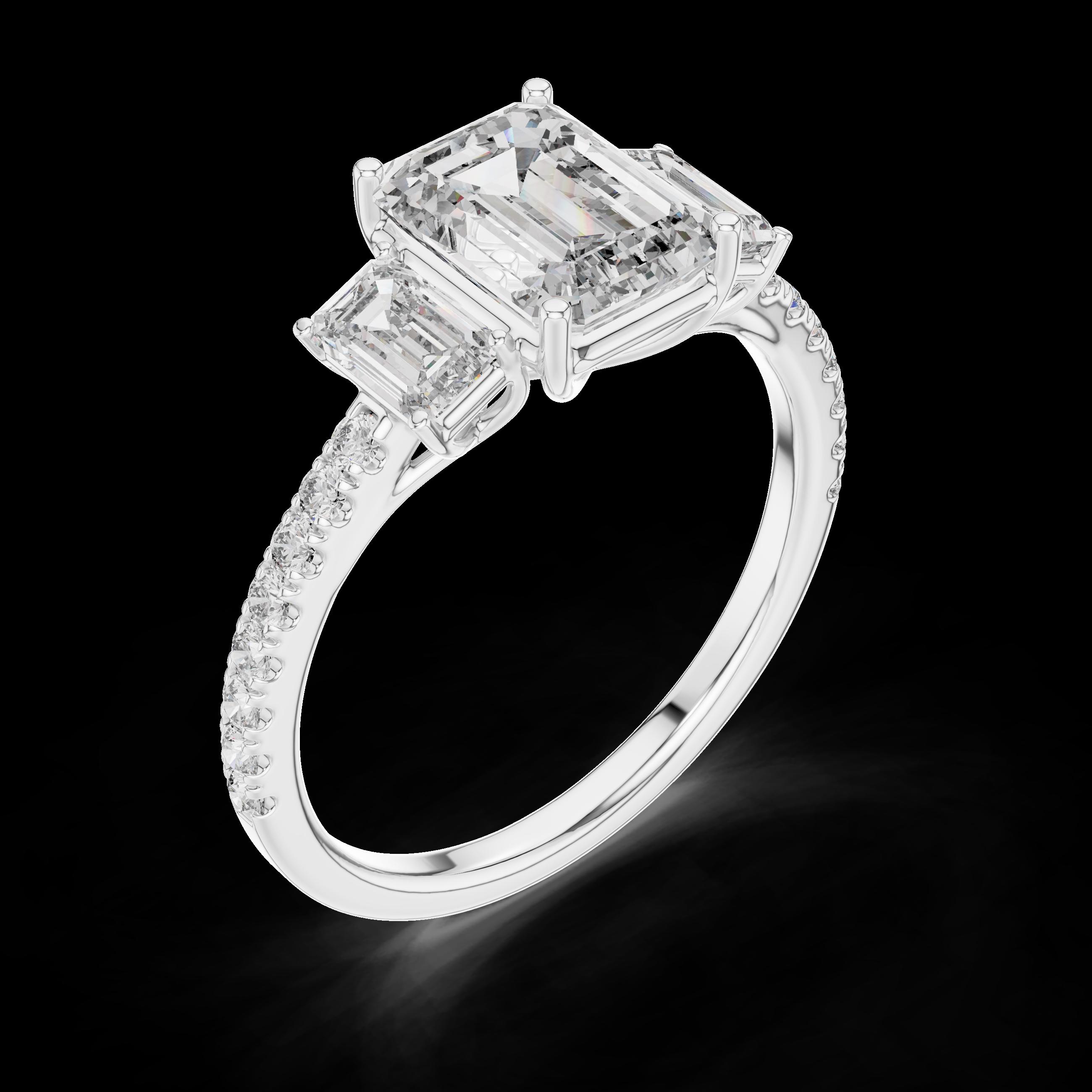 Celebrate timeless elegance with this emerald cut lab diamond three-stone engagement ring, a symbol of love, balance, and new beginnings. The bold emerald center stone, flanked by matching step-cut side stones, creates a sophisticated look, while the diamond-accented band adds brilliance from every angle. Perfect for engagements or anniversaries, this piece reflects enduring style and grace.